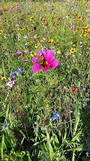 In kleiner Gruppe, aber mit bester Laune, Sonnenschein und blauem Himmel wanderten wir vom Ortszentrum Schnaitsee vorbei an einer herrlichen Blumenwiese Richtung der Windräder, dem Fernsehturm zur Ölmühle Garting. Dort trafen wir zufällig den Besitzer auf seinem Feld an und erfuhren bei einem netten Ratsch, dass sogar Chiasamen, Mariendistel und Hirsearten in der Umgebung angebaut werden.