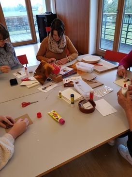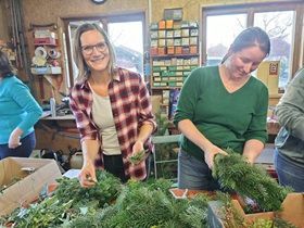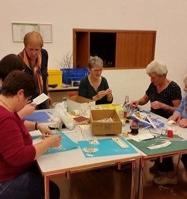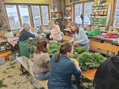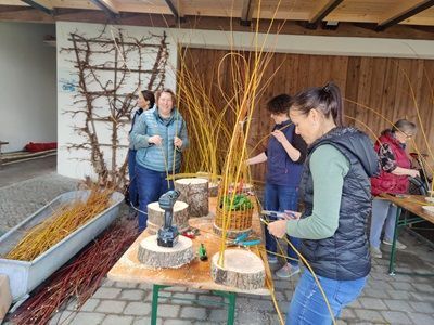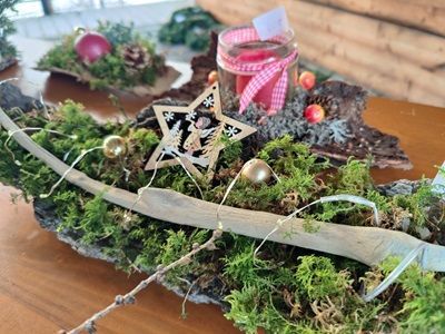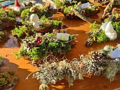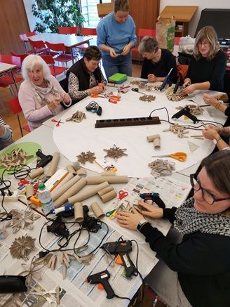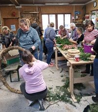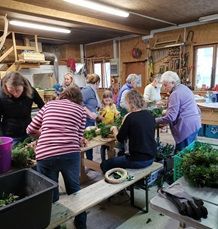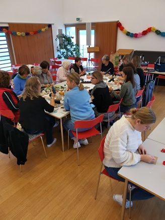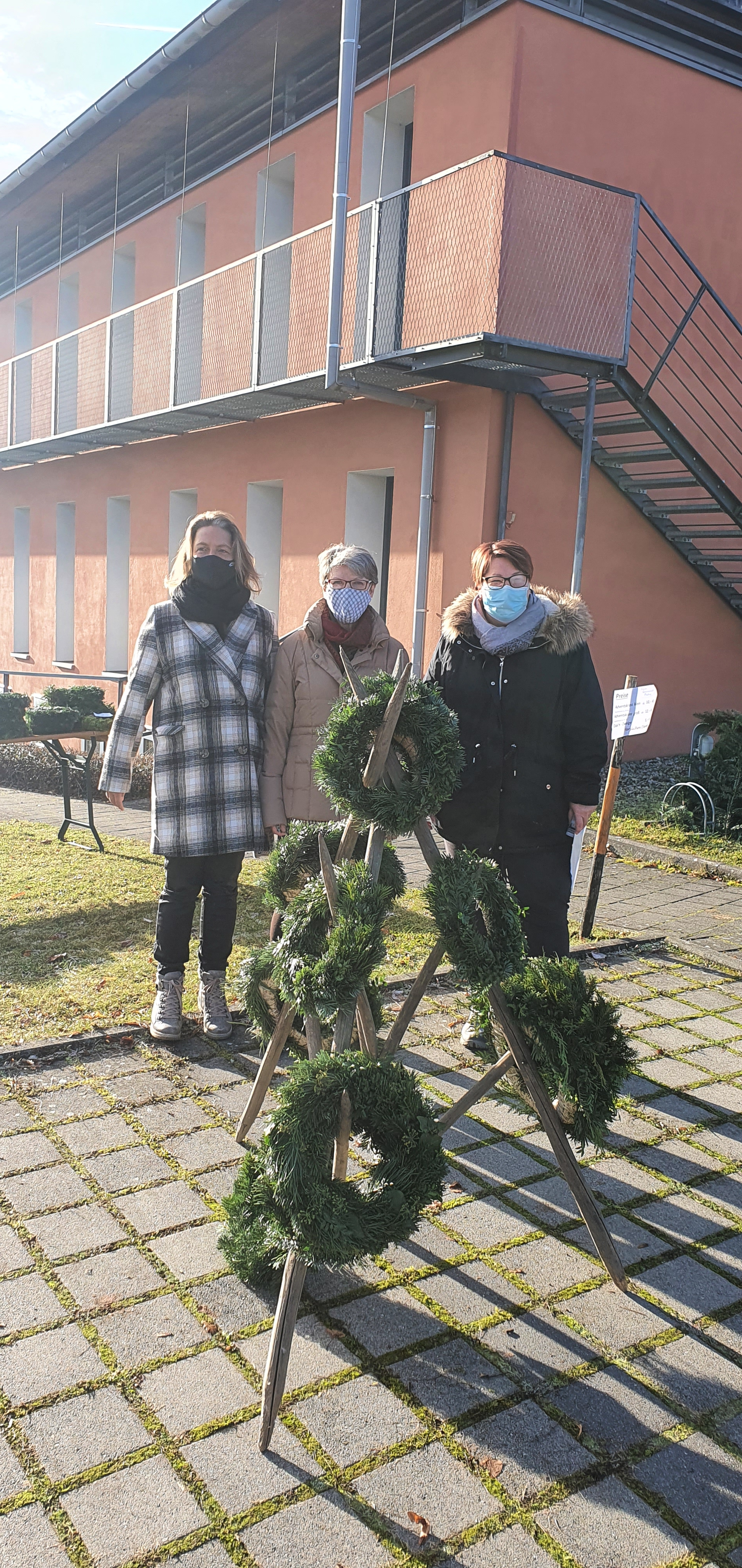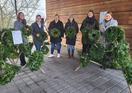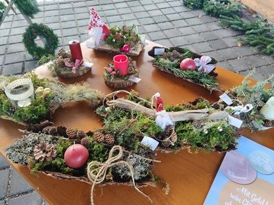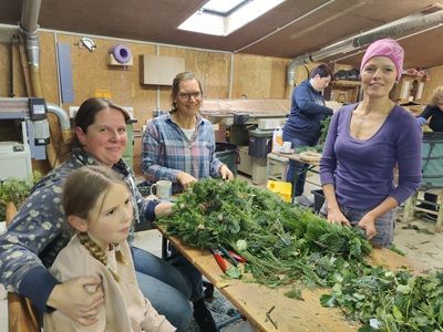 Viele fleißige Hände halfen zusammen, um Tannen-, Kiefern- und viele weitere Zweige, Strohkränze und Bindematerial zur Verfügung zu stellen. Daraus wurden rund 80 Advents- und Türkränze in ehrenamtlicher Heimarbeit gebunden. Die jüngste Helferin war 13 und die älteste 87 Jahre alt.