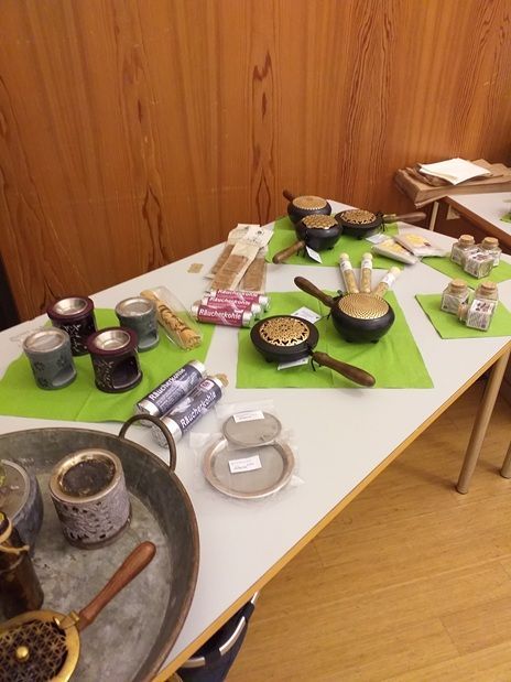 die Kränze mit Weihwasser und Weihrauch.
