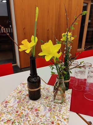 auf der schattigen & frühlingshaft dekoriertenTerrasse vom ehemaligen Jugendraum am Pfarrheim ein.