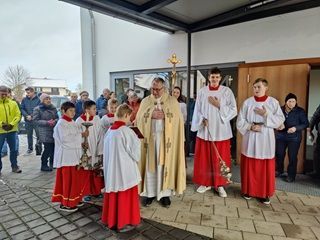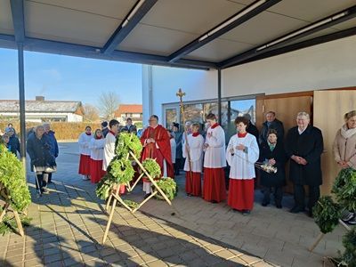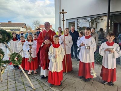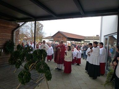 Zum Patroziniumsfest am 27.11.2022 zu Ehren der Heiligen Katharina in Pfaffing segnete Pfarrer Josef Huber vor dem Verkauf