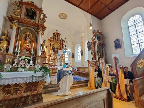 Die traditionelle Maiandacht in Übermoos konnte in diesem Jahr wieder "ganz normal" abgehalten werden. - Ohne Auflagen in der wunderschönen Kirche in Übermoos. Die musikalische Gestaltung wurde mit harmonischen Gitarren- und Hackbrettklängen vom Ensemble "Immer guad aufglegt" übernommen.