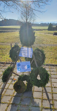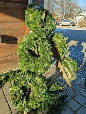 Wie in jedem Jahr stiftete Alois Neumeier wunderschöne, einheimische Tannenzweige. Zudem wurden viele verschiedene Zweige von Thuja, Efeu, Buchs, Zypresse, Konifere sowie Ilex, bereit gestellt. In der beheizten Werkstatt von Familie Spötzl haben sich wieder viele fleißige Hände gefunden, die in ihrer Freizeit rund 90 Kränze gebunden und viele Naturgestecke gebastelt haben.