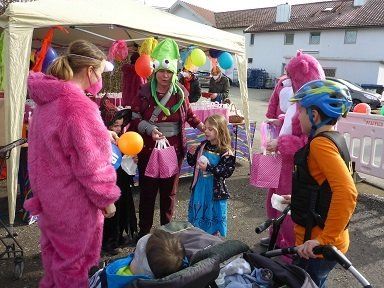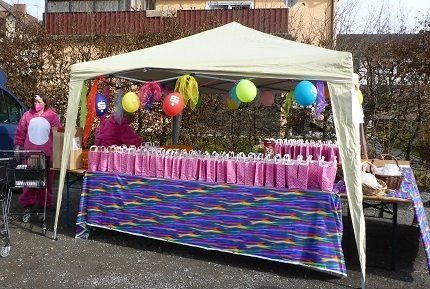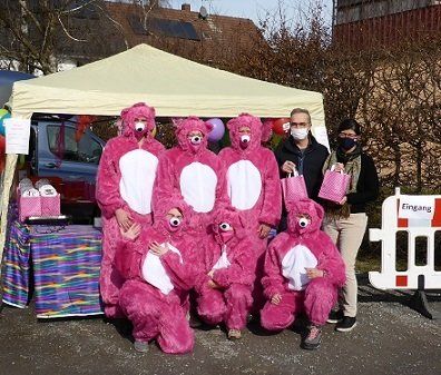Somit hielten die Pfaffinger Frauen an ihrem Plan fest. Mit Pavillon und liebevoller Dekoration platzierten sie sich als pinke Bären auf dem sonnigen Parkplatz vom Pfaffinger Edeka. Rund 150 Tüten wurden mit leckerem Schmalzgebäck und Piccolos gepackt & dekoriert. Über den Nachmittag wurden fast alle Tüten verkauft. Der Absatz gestaltete sich nicht so schwungvoll wie im vergangen Jahr. Trotzdem tat es allen gut, für einige Stunden die kleinen und großen Sorgen etwas in den Hintergrund „schieben“ zu können.